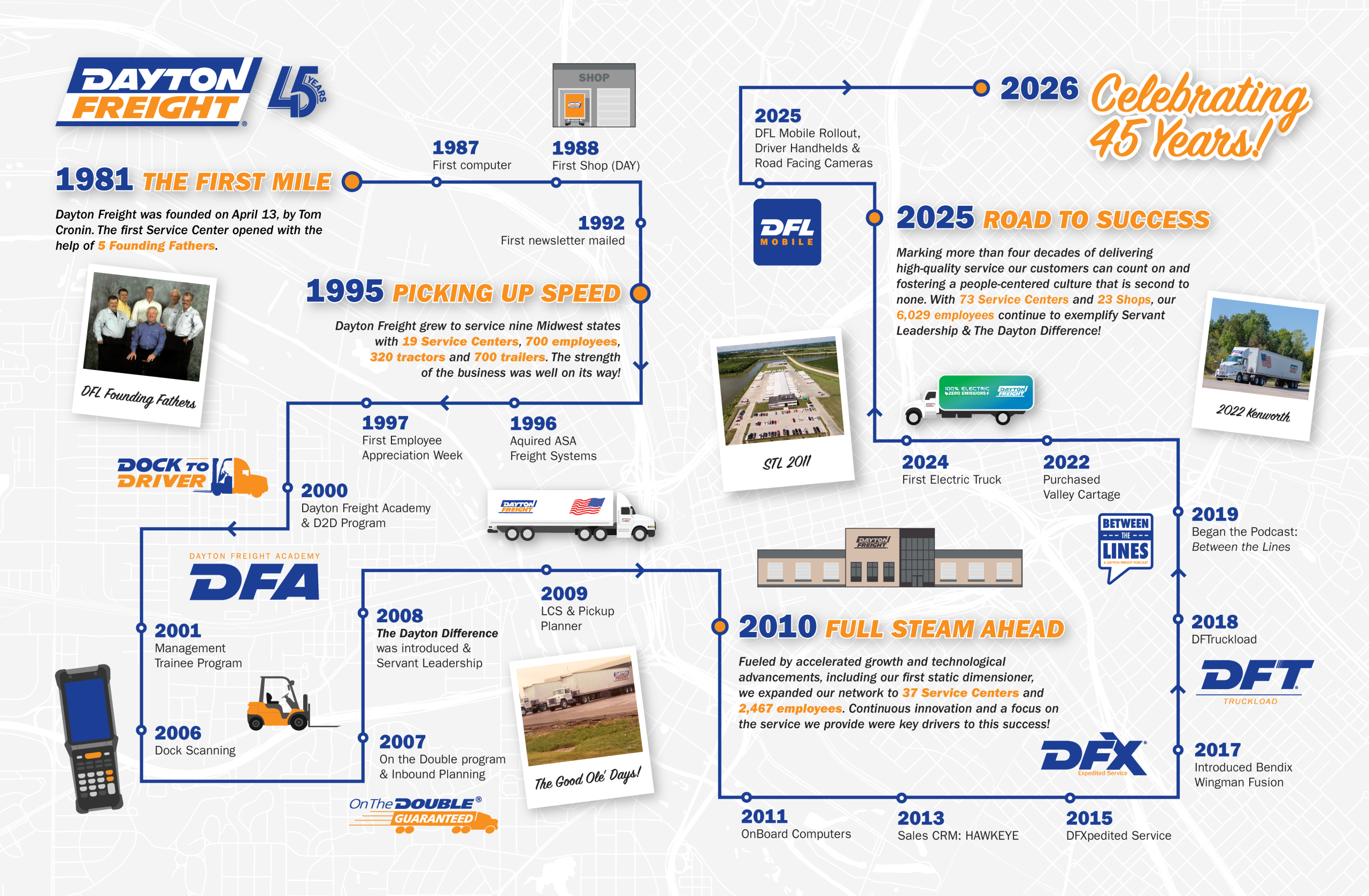 Four and a half decades later, Dayton Freight continues to grow, succeed and deliver excellent service to our customers. This milestone isn’t just about the years; it’s about the people who made it possible. To our employees, customers, partners and vendors: Thank you for your trust and loyalty.